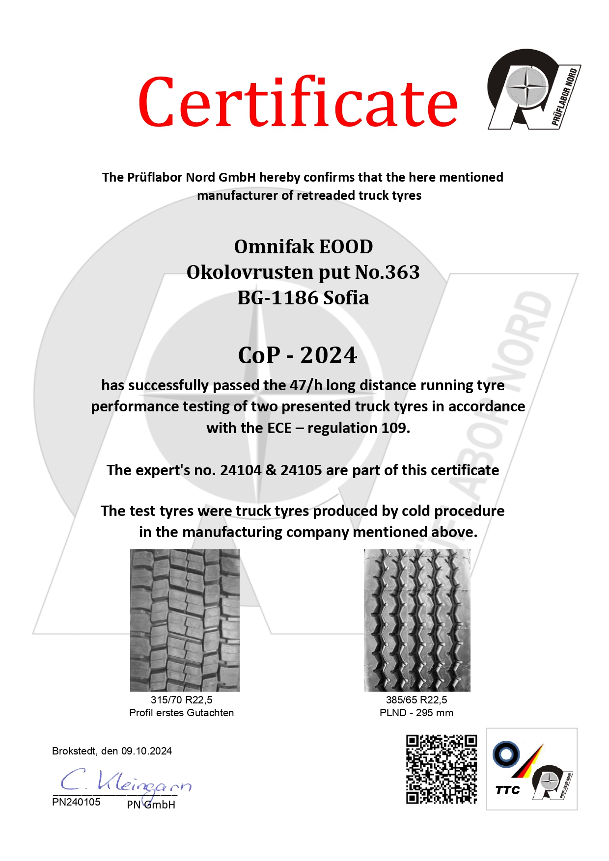 Вече над 20 години ОМНИФАК произвежда студен регенерант с помощта на най-модерна техника и висококачествени материали. Производството на регенерирани гуми за автобуси се осъществява по технология на Avon, Kraiburg и други първокласни материали. Високото качество на произведените при нас продукти стои в основата на дългогодишната ни успешна фирмена дейност. С цел поддържане високия стандарт на качество, ние се стремим да обновяваме постоянно оборудването ни. В момента цехът за регенерат е напълно обновен с машини ново поколение на MATTEUZZI – Италия и I.R.O.P- Италия. Екип от висококвалифицирани специалисти преминава регулярно през специализирани обучения, с цел поддържане на професионализма и качеството на крайния продукт.